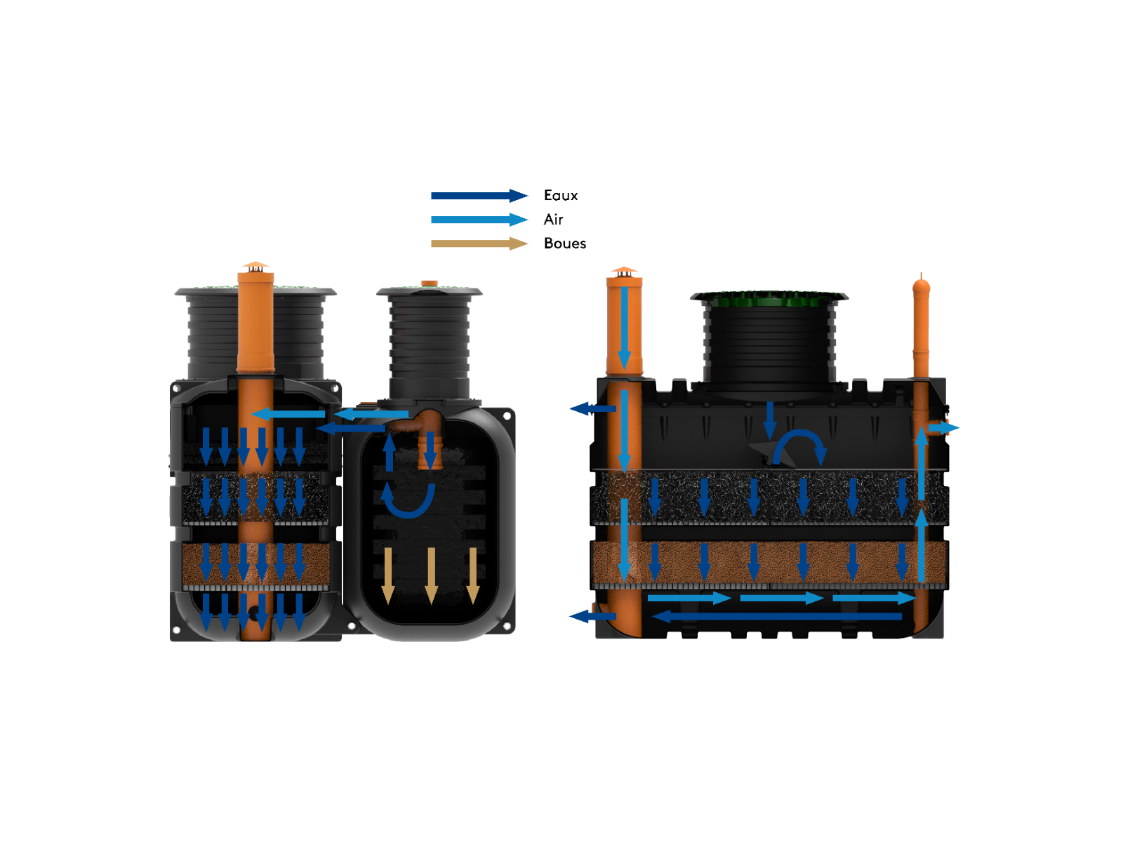 Oczyszczanie ścieków zaczyna się w osadniku wstępnym, w którym oddzielają się i opadają na dno frakcje grube i zatrzymują się tłuszcze. Proces ten jest wspomagany bakteriami beztlenowymi. Wstępnie oczyszczony ściek bez gruboziarnistych frakcji przepływa do strefy biologicznego oczyszczania i filtracji znajdującej się w drugim zbiorniku. Następnie ścieki są równomiernie rozprowadzane po powierzchni złoża biologicznego – specjalnie dobranych warstw o różnym składzie i granulacji za pomocą przechylającego się koryta. Dopływające z domu ścieki podnoszą poziom w osadniku wstępnym, które przepływają do reaktora biologicznego i napełniają koryto. Po osiągnięciu maksymalnego poziomu koryto przechyla się na jedną ze stron, a ścieki przepływają pionowo przez złoże oczyszczając się. Pierwsza warstwa wypełnienia składa się z włókien syntetycznych, wypełnieniem drugiej jest materiał mineralny. Układ wentylacji umożliwia dobre natlenienie złoża, a tym samym rozwój bakterii tlenowych, odpowiedzialnych za biologiczną redukcję zanieczyszczeń. Ścieki oczyszczone po przesączeniu się przez obie warstwy odpływają poprzez otwór znajdujący się na dnie zbiornika.