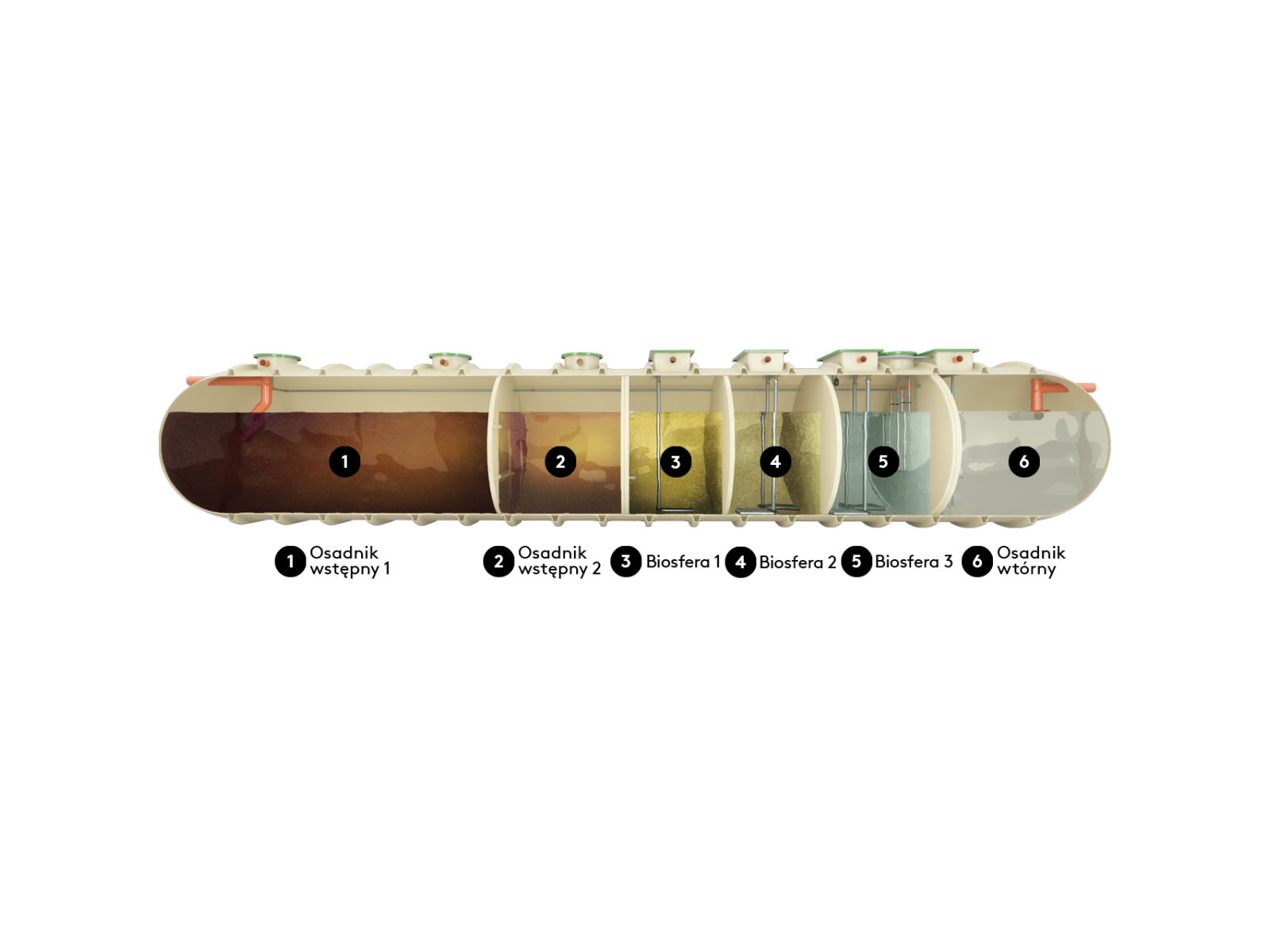 Biologiczna oczyszczalnia w technologii złóż fluidalnych, zbiornik z GRP, wyposażona w zintegrowane części osadnikowe, bioreaktory z układem napowietrzania, pokrywy zamykane na zamki, układ sterowania, wyposażenie zależne od wybranego modelu oraz opcji.